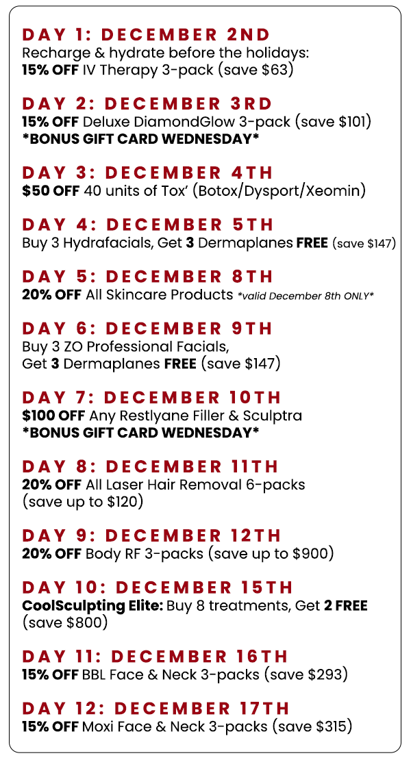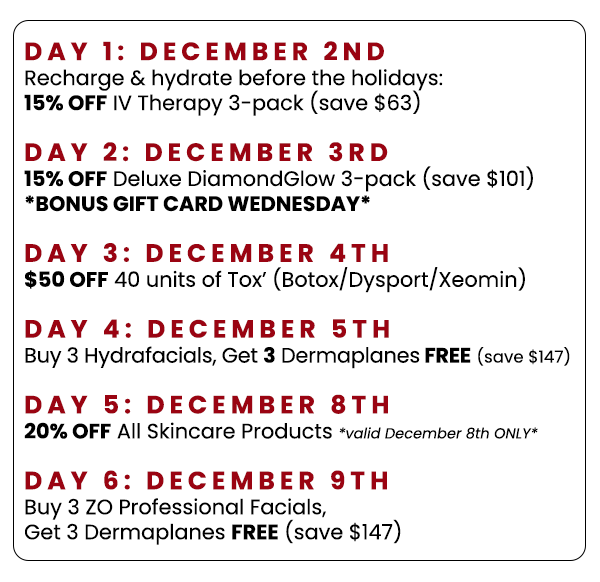 The holidays are officially here! Celebrate the season with limited-time savings on our most-loved treatments, packages, and wellness services. Enjoy festive offers all December long as you stock up on self-care for the New Year or surprise someone with the ultimate Chronos experience.